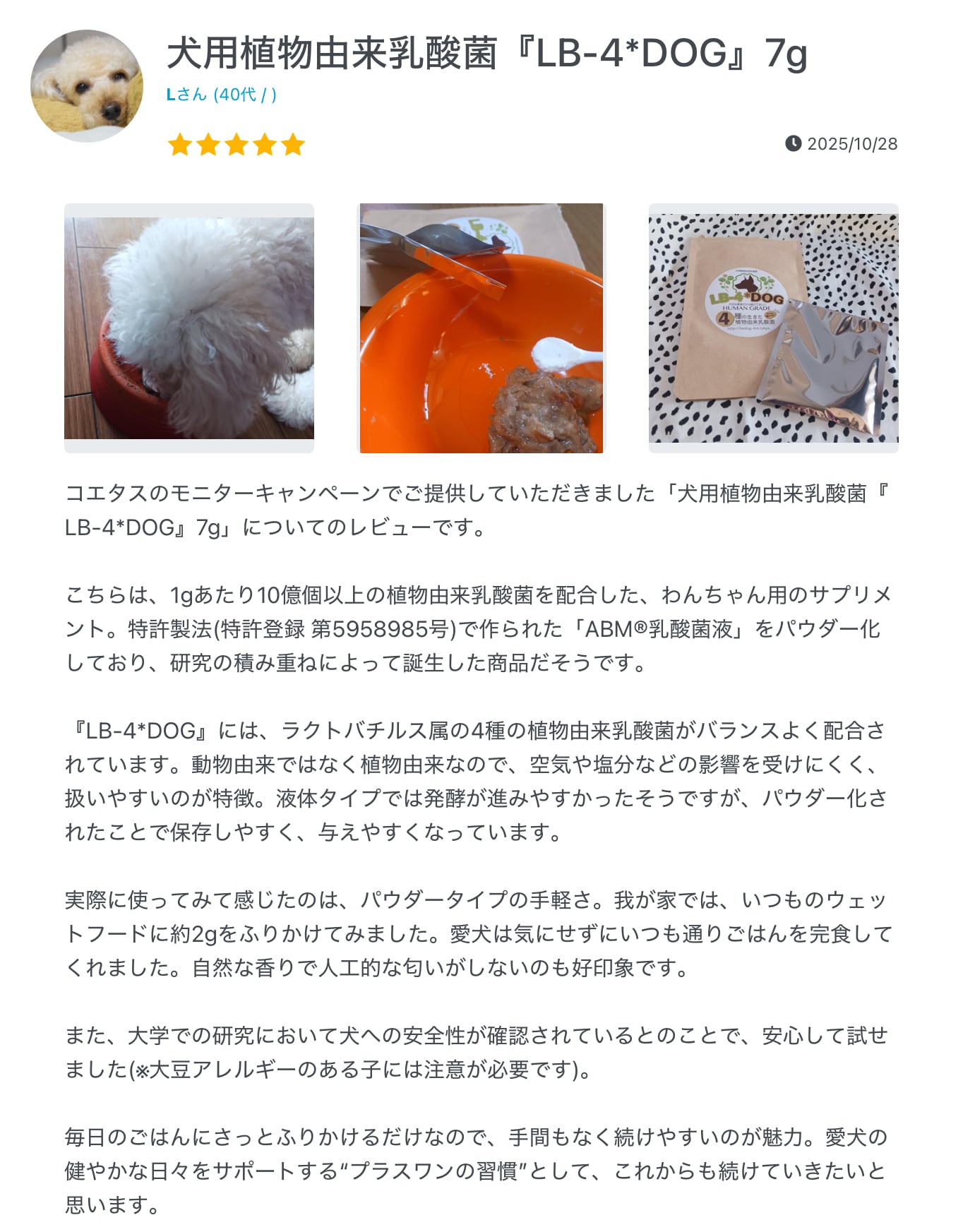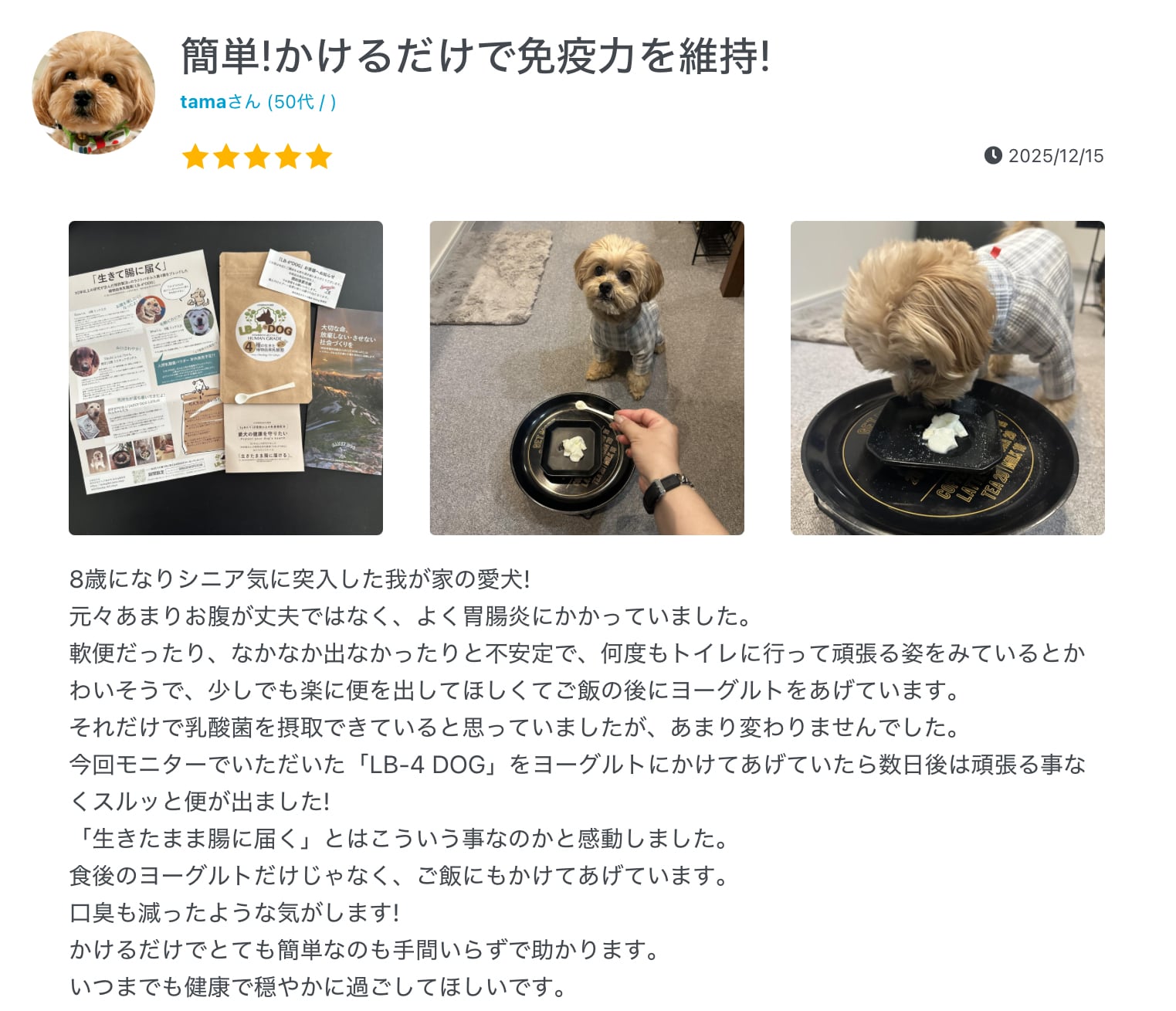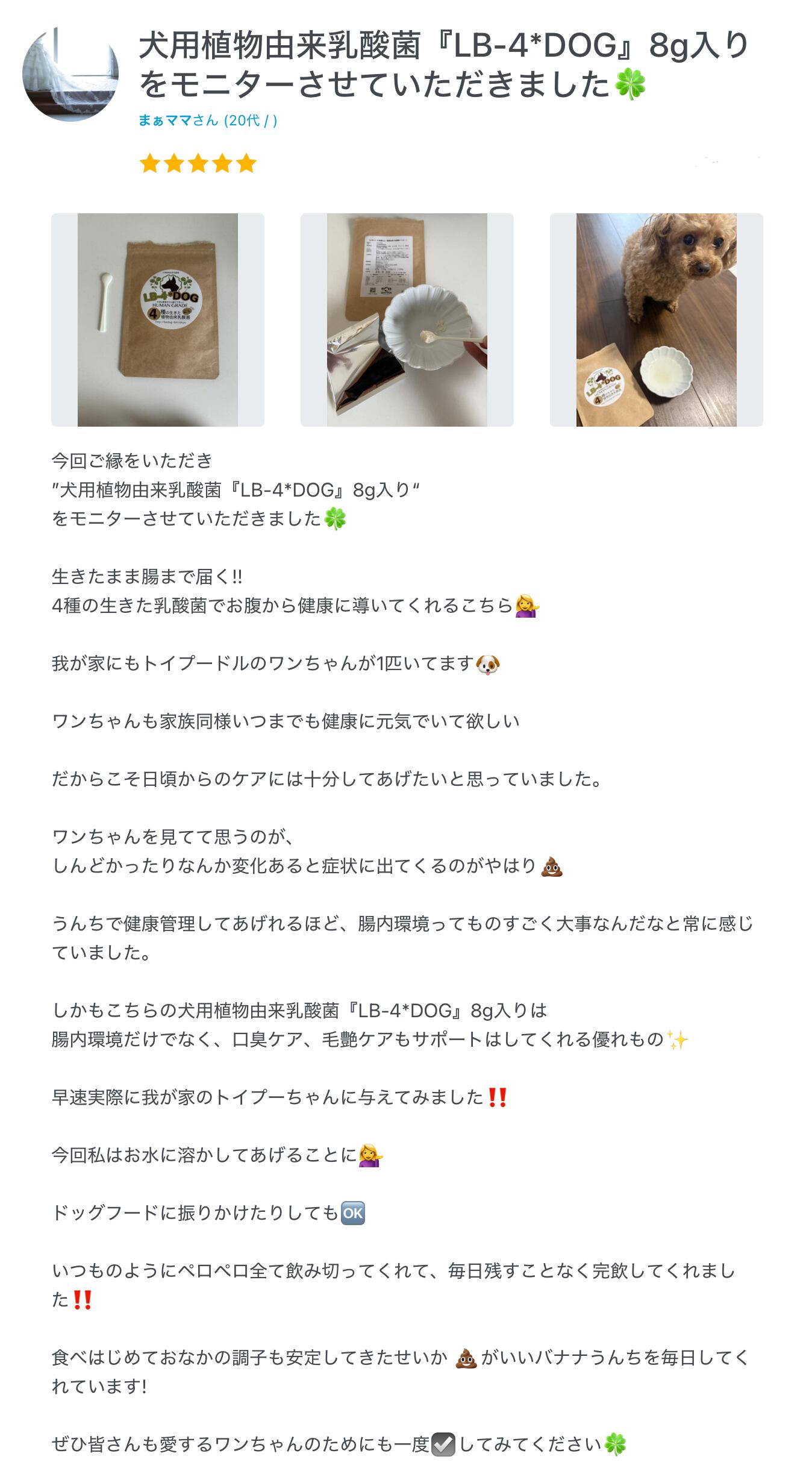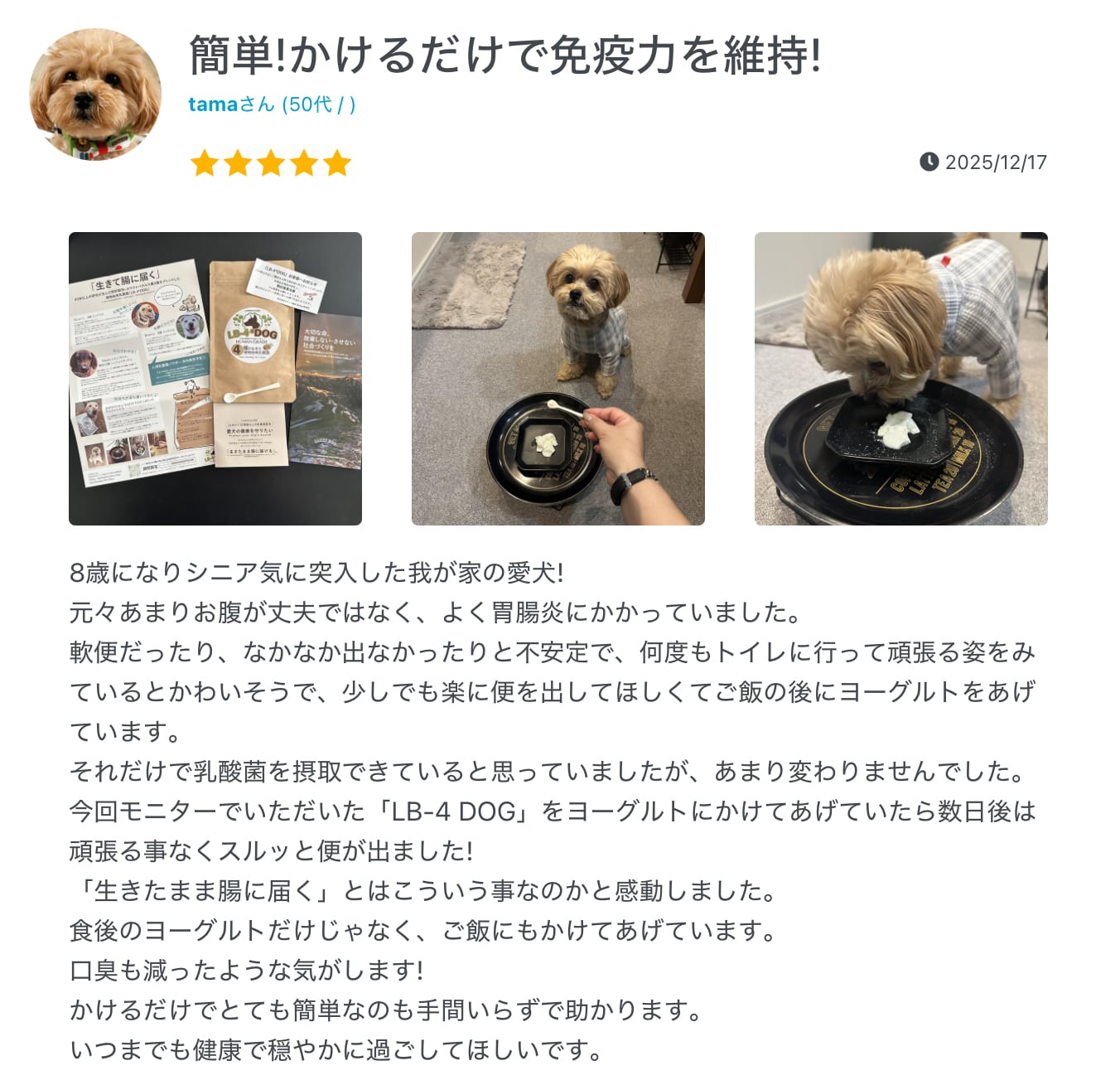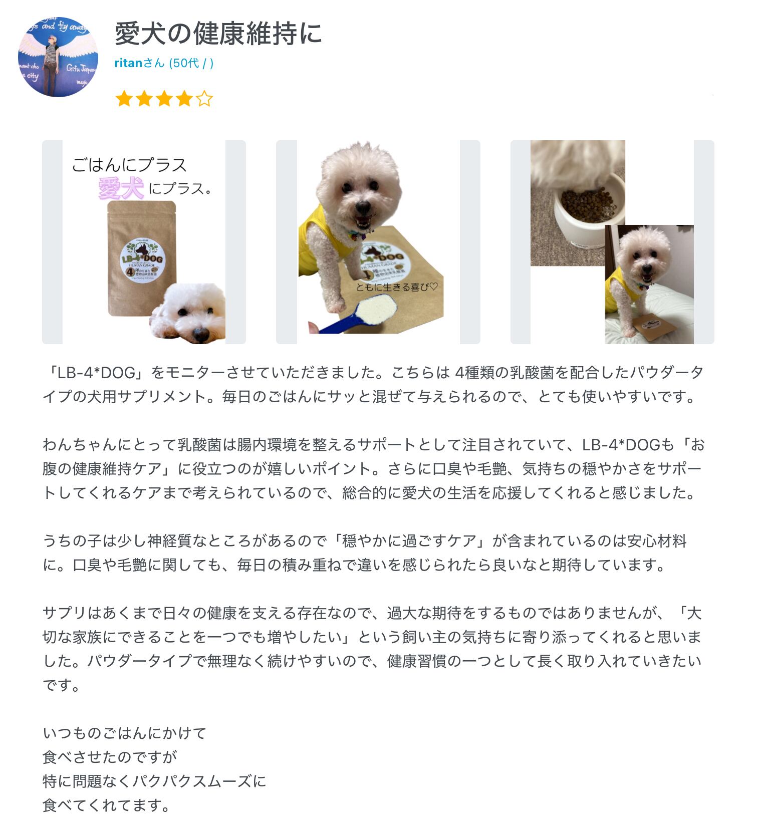 『LB-4*DOG』を愛用しているわんちゃん達の変化報告や、モニターさん達からの感想などを掲載していきます。(内容はいただいたままをコピーして掲載しています)
