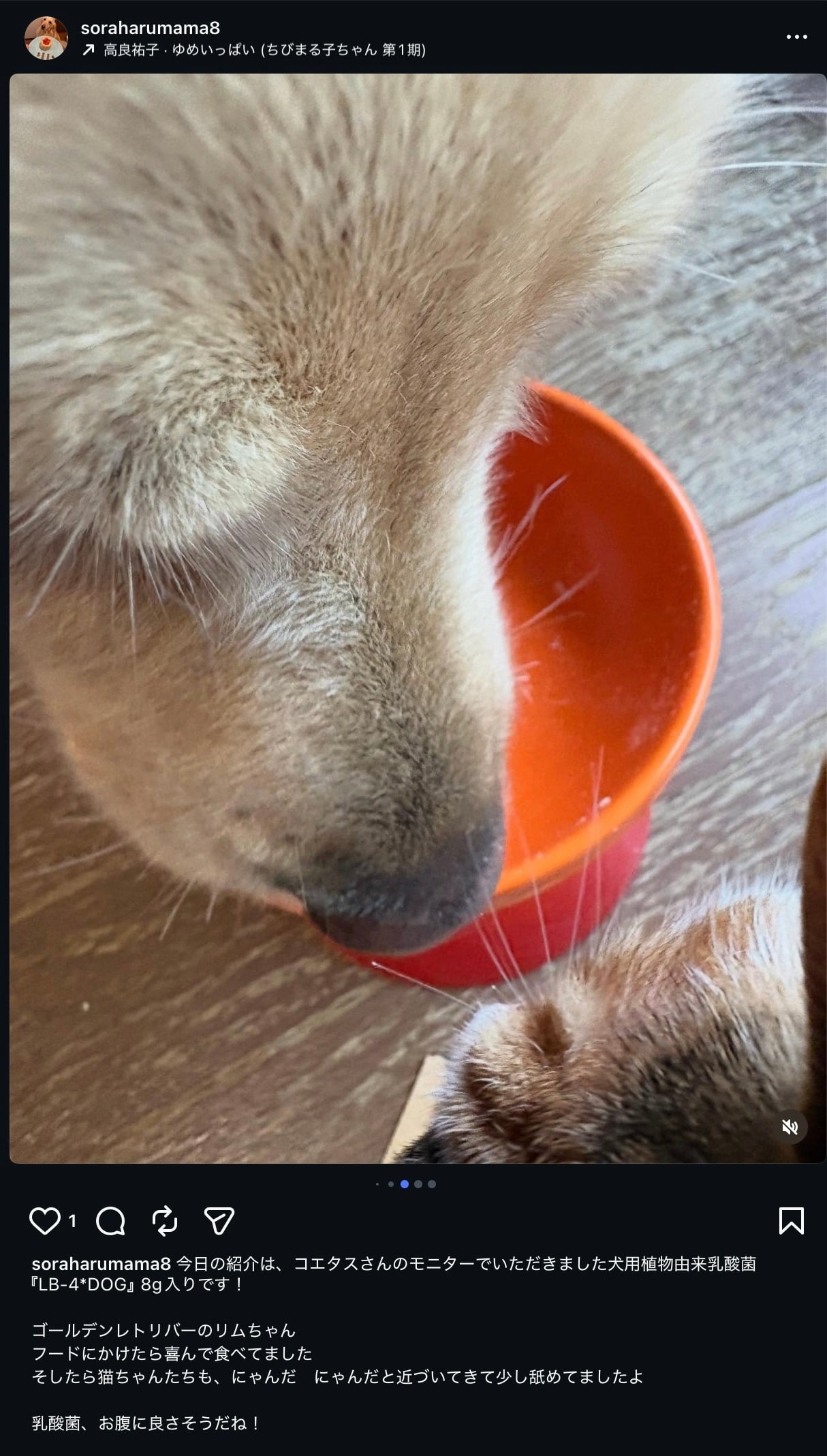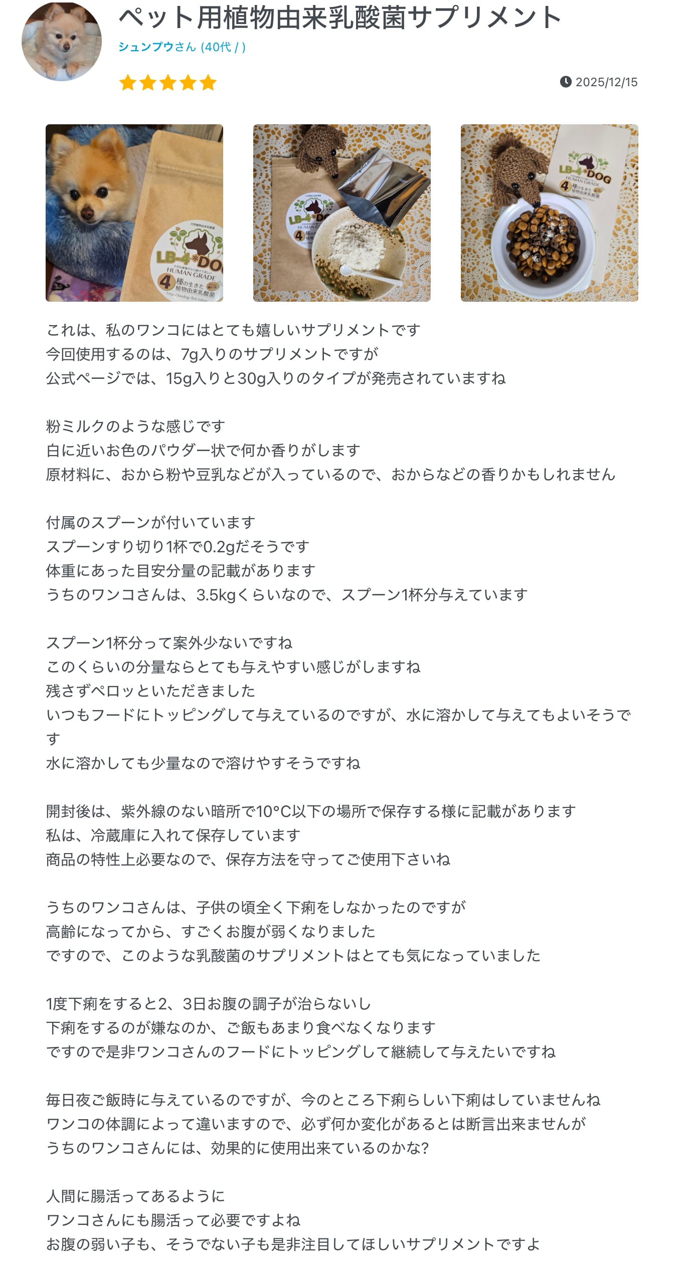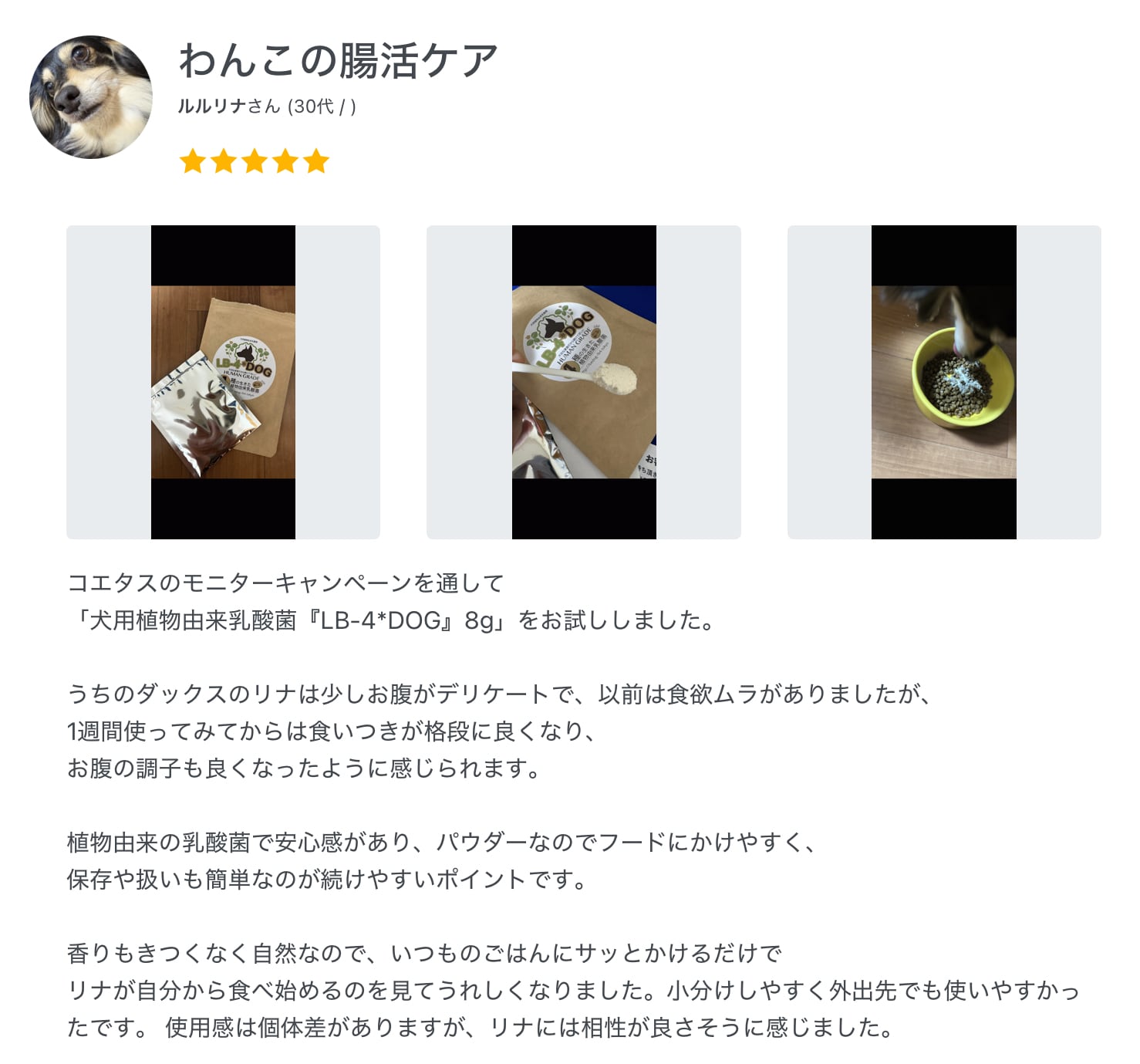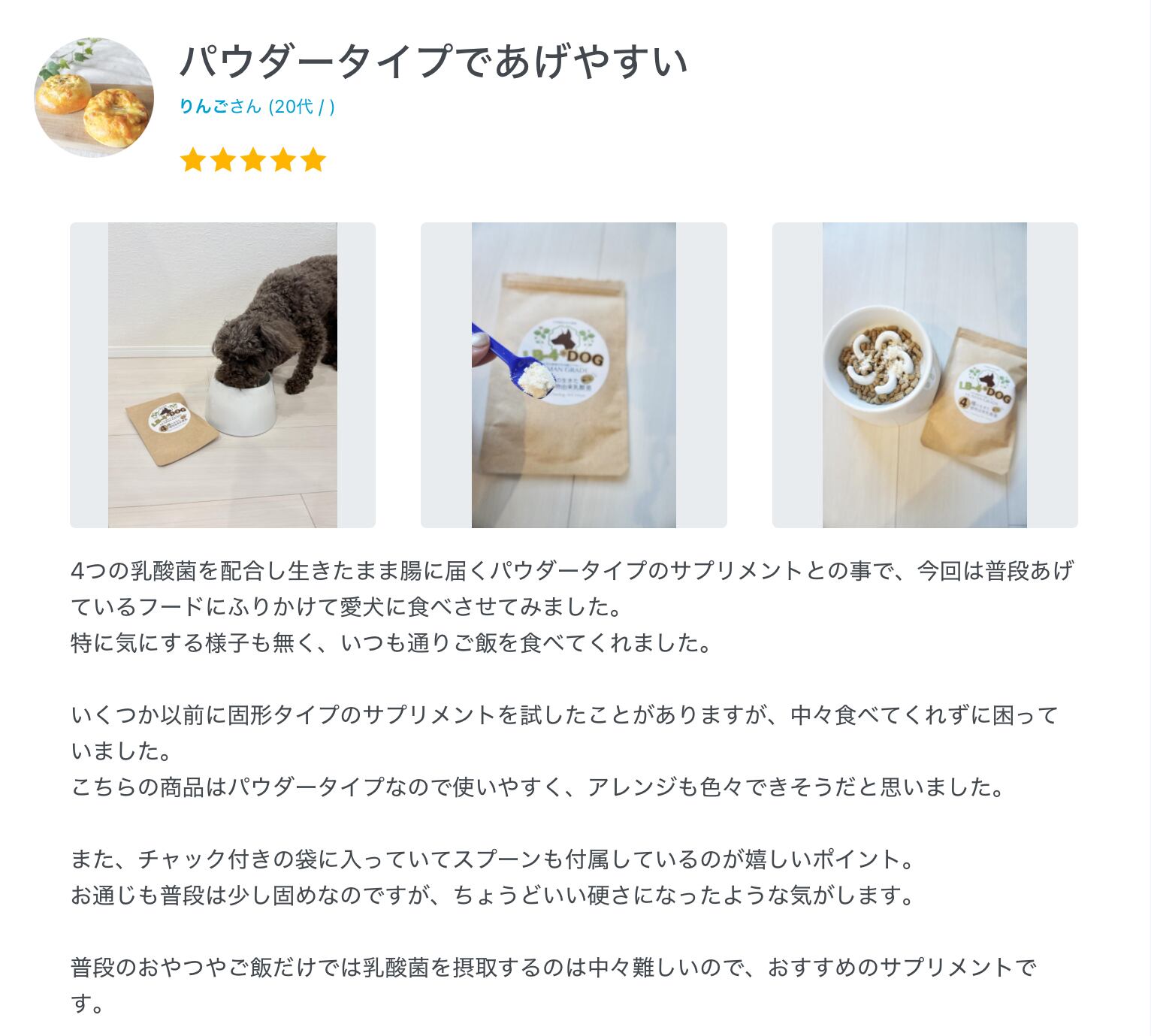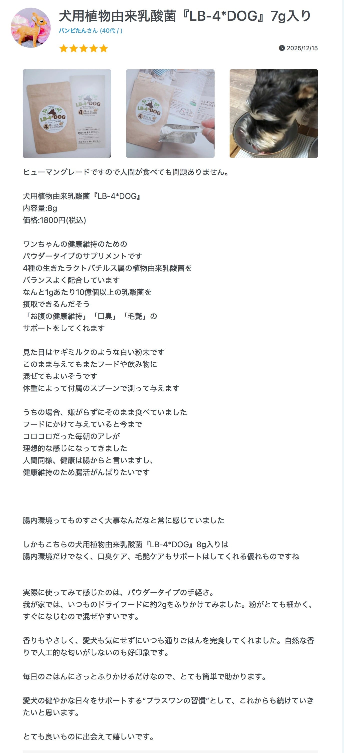 『LB-4*DOG』を愛用しているわんちゃん達の変化報告や、モニターさん達からの感想などを掲載していきます。(内容はいただいたままをコピーして掲載しています)